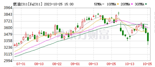 國(guó)內(nèi)市場(chǎng)方面,上海期貨交易所掛牌交易的燃油2311期貨合約在夜盤交易時(shí)曾一度大跌接近8%,夜盤收盤時(shí)仍下跌4.07%,報(bào)收于3415點(diǎn)。10月25日,該期貨合約再度下跌5.90%,報(bào)收于3350點(diǎn)。該合約自9月28日最高點(diǎn)3892點(diǎn),已累計(jì)下跌13.92%。