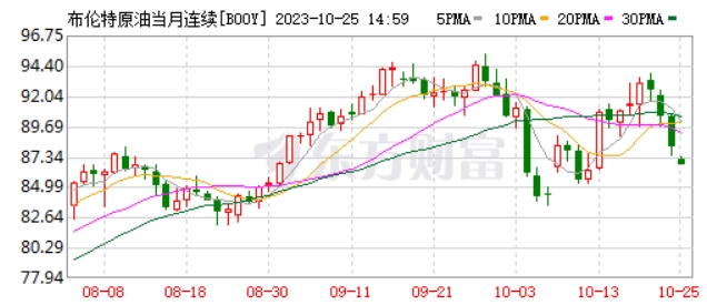 無(wú)獨(dú)有偶,美國(guó)洲際交易所布倫特原油當(dāng)月連續(xù)合約于北京時(shí)間10月25日?qǐng)?bào)價(jià)86.74點(diǎn)。此前,因地緣沖突導(dǎo)致該合約一度向上觸及95.35點(diǎn),目前上漲幅度也已全部抹平,自高點(diǎn)累計(jì)回落9.03%。