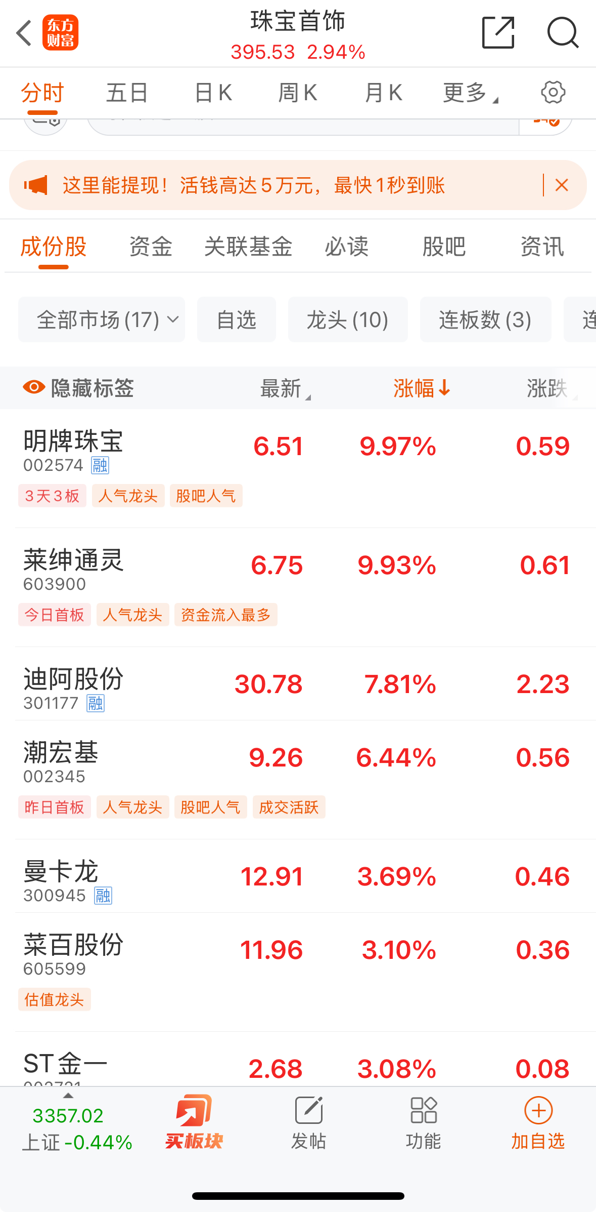 3月13日,A股市場(chǎng)珠寶首飾板塊盤(pán)中震蕩拉升,成份股中多股大漲,浙江明牌珠寶股份有限公司(簡(jiǎn)稱(chēng)“明牌珠寶”,證券代碼:002574)更是實(shí)現(xiàn)3連板,萊紳通靈珠寶股份有限公司(簡(jiǎn)稱(chēng)“萊紳通靈”,證券代碼:603900)漲停,廣東潮宏基實(shí)業(yè)股份有限公司(簡(jiǎn)稱(chēng)“潮宏基”)、迪阿股份有限公司(簡(jiǎn)稱(chēng)“迪阿股份”)等個(gè)股紛紛大漲。截至午間收盤(pán),珠寶首飾板塊報(bào)收395.53點(diǎn),漲2.94%。