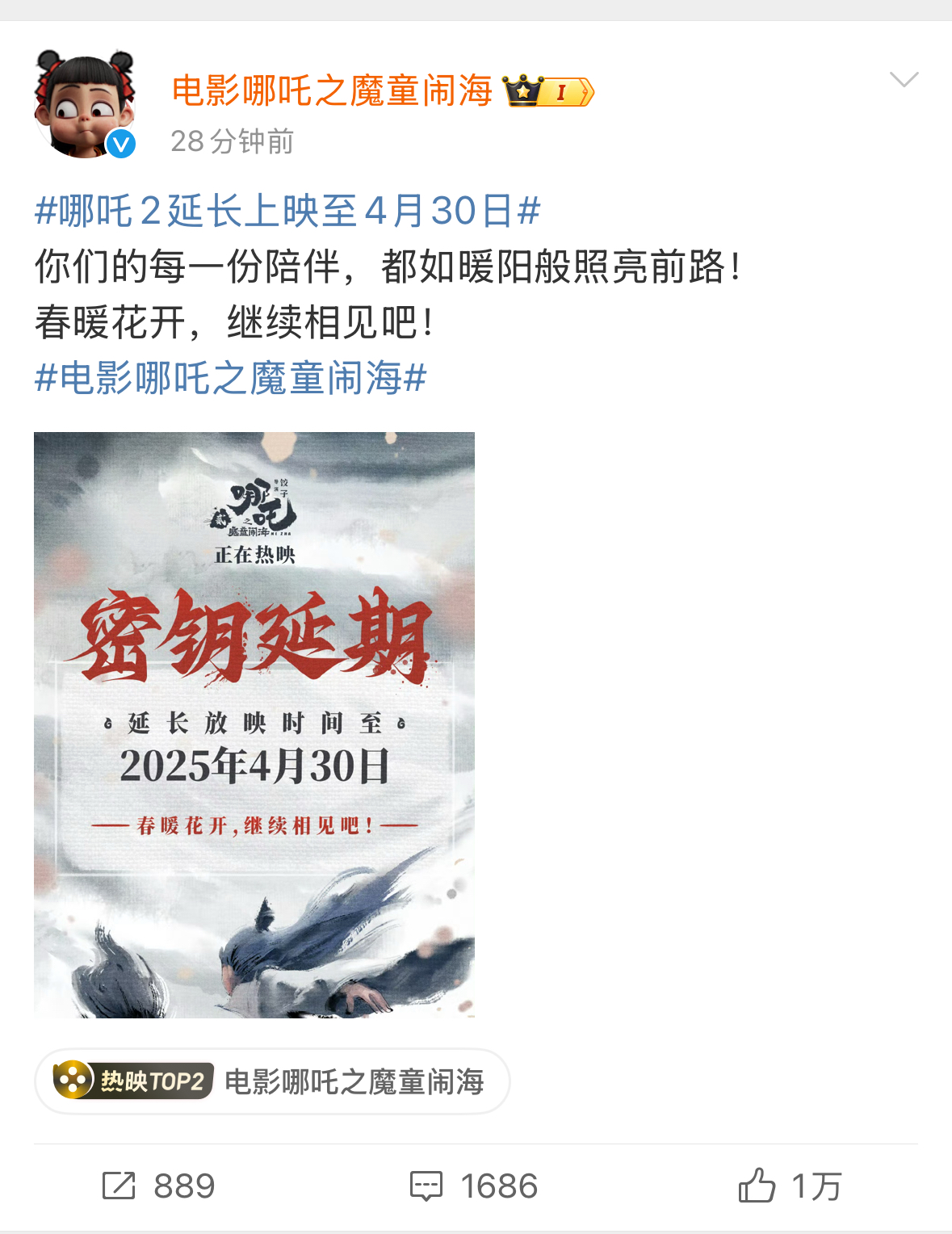 3月21日,電影哪吒之魔童鬧海(《哪吒2》)宣布延長上映至4月30日。