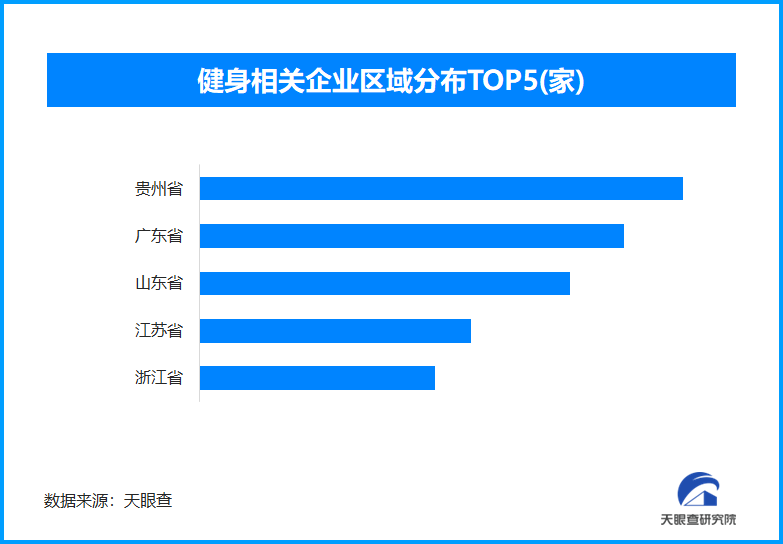 天眼查專業(yè)版數(shù)據(jù)顯示,截至目前,我國現(xiàn)存在業(yè)、存續(xù)狀態(tài)的健身相關(guān)企業(yè)超163.6萬家。從區(qū)域分布來看,貴州省、廣東省、山東省、江蘇省健身相關(guān)企業(yè)數(shù)量位居前列,四個省份數(shù)量總和超過59萬余家,占企業(yè)總數(shù)的36.07%。