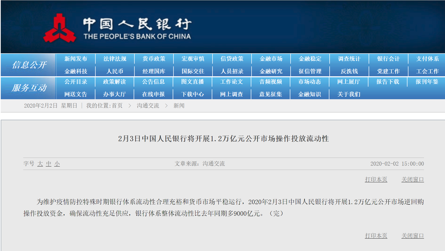 2月2日,央行發(fā)布公告,為維護疫情防控特殊時期銀行體系流動性合理充裕和貨幣市場平穩(wěn)運行,2020年2月3日中國人民銀行將開展1.2萬億元公開市場逆回購操作投放資金,確保流動性充足供應,銀行體系整體流動性比去年同期多9000億元。