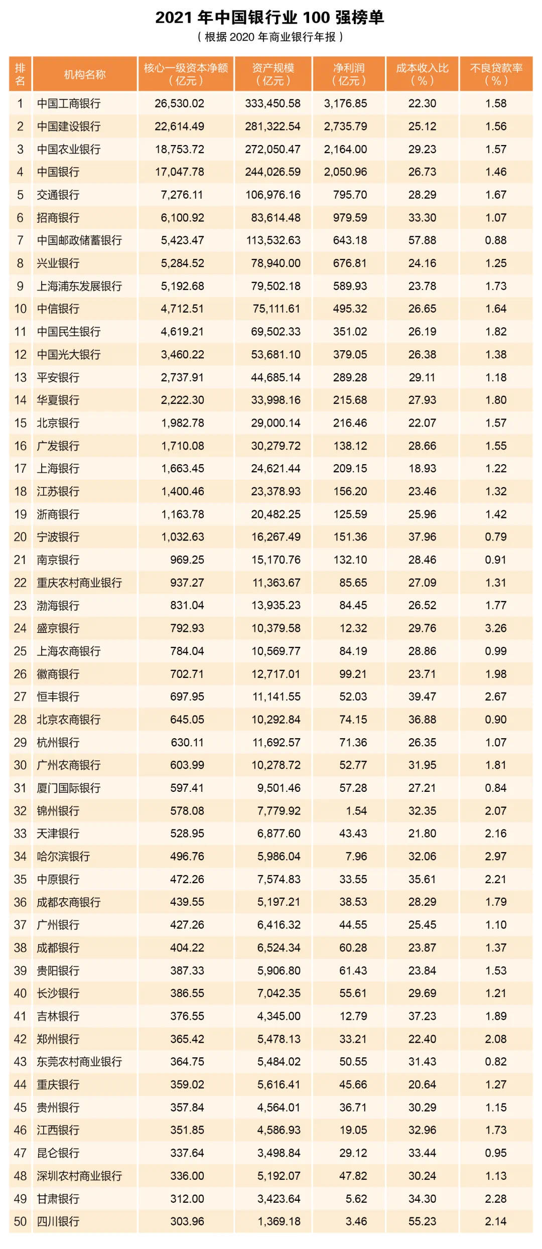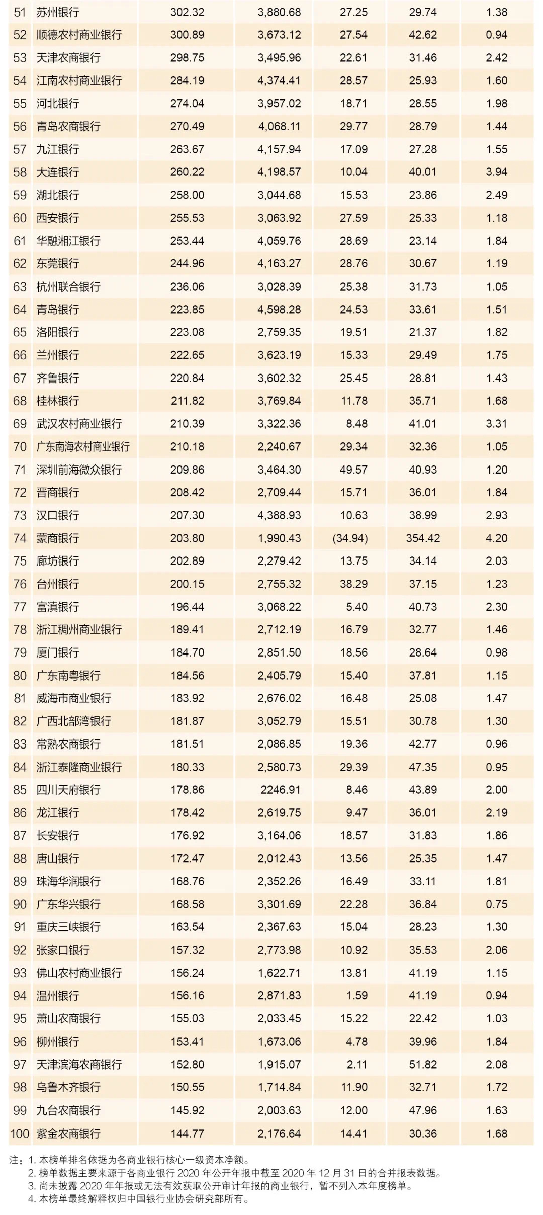本榜單參考巴塞爾協(xié)議Ⅲ和監(jiān)管機(jī)構(gòu)相關(guān)要求,按核心一級(jí)資本凈額排序,并對中國銀行業(yè)前100家銀行的經(jīng)營規(guī)模、盈利能力、運(yùn)營效率及資產(chǎn)質(zhì)量進(jìn)行綜合展示。為了確保榜單的權(quán)威性、客觀性及公正性,榜單數(shù)據(jù)主要來源于各商業(yè)銀行2020年公開年報(bào),并覆蓋所有中資商業(yè)銀行。本次上榜的100家銀行資產(chǎn)總和占商業(yè)銀行總資產(chǎn)的90.04%,創(chuàng)造了商業(yè)銀行97.15%的凈利潤,包括6家大型銀行,12家全國性股份制商業(yè)銀行,61家城市商業(yè)銀行、20家農(nóng)村商業(yè)銀行和1家民營銀行。