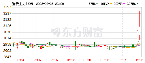 在國內(nèi)方面,東方財(cái)富CHOICE終端顯示,截至北京時間2月25日3點(diǎn)收盤時,強(qiáng)麥主力合約一改往日波瀾不驚的表現(xiàn),連續(xù)兩日上漲,最高漲至每噸3293元,玉米主力合約一度漲至最高每噸2883元,豆一主力合約一度漲至每噸6512元,豆粕主力一度漲至每噸4202元。與國際市場不同的是,國內(nèi)糧食期貨合約出現(xiàn)了明顯沖高回落的走勢,截至收盤時強(qiáng)麥等部分品種已回吐大部分漲幅。
