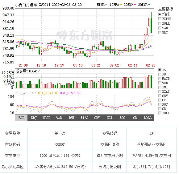 截至北京時間2月25日晚間6點(diǎn),芝加哥商品交易所糧食合約價格盤中出現(xiàn)大面積飆漲行情。其中,小麥期貨合約漲幅5.65%,一度上漲至934.75美分/蒲式耳,為2012年7月以來的最高水平。玉米期貨合約漲幅達(dá)5%,一度上漲至716.25美分/蒲式耳,為2021年6月10日以來的最高水平。大豆期貨合約漲幅達(dá)4.7%,一度上漲至1756美分/蒲式耳,為2012年以來最高水平。豆粕期貨合約漲3.8%,豆油期貨合約漲5.67%。泛歐交易所小麥期貨開盤后大漲,小麥期貨主力合約上漲14%,至每噸335.00歐元,玉米期貨合約上漲11%,至每噸296.25歐元。國際金融機(jī)構(gòu)普遍認(rèn)為,地緣政治事件是本次大面積合約上漲的主要原因。
