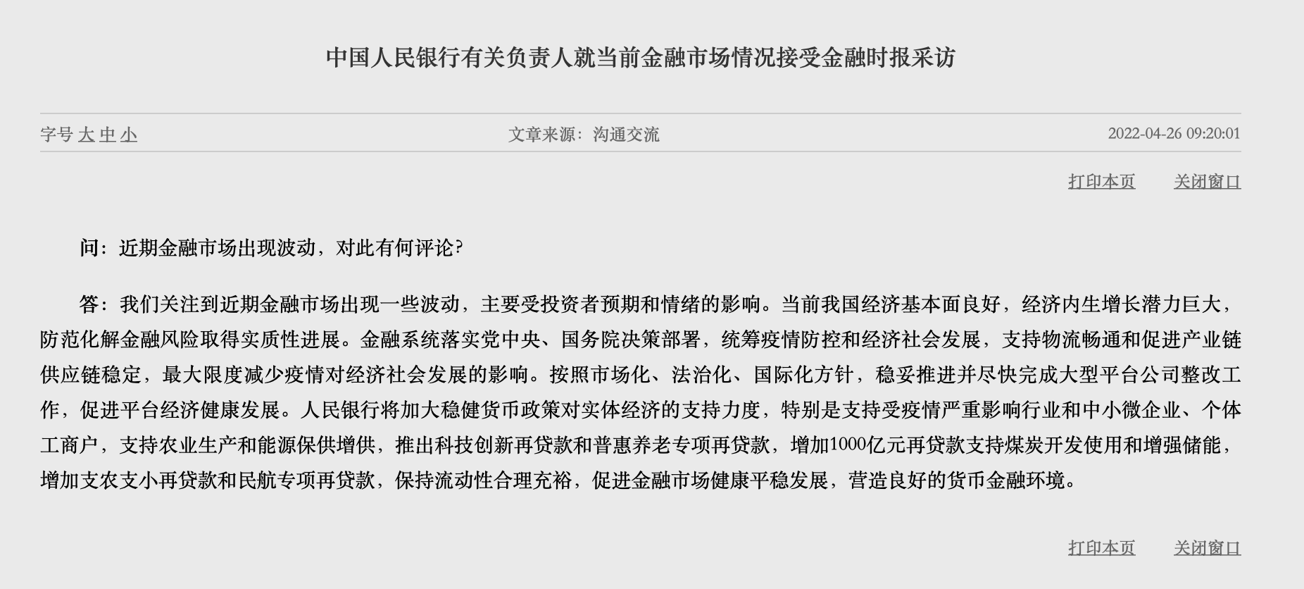 4月26日上午9時20分,中國人民銀行有關負責人就當前金融市場情況接受金融時報采訪時表示,人民銀行關注到近期金融市場出現(xiàn)一些波動,主要受投資者預期和情緒的影響。當前我國經(jīng)濟基本面良好,經(jīng)濟內(nèi)生增長潛力巨大,防范化解金融風險取得實質(zhì)性進展。