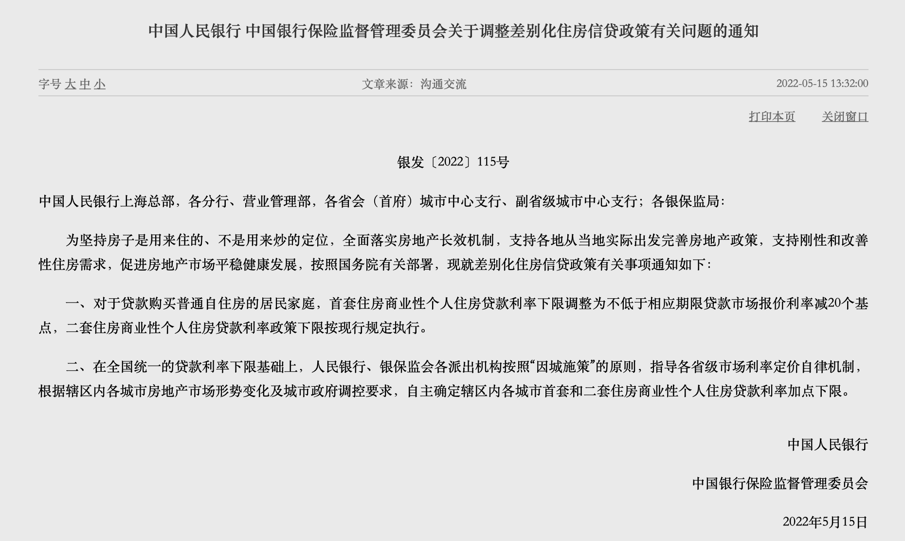 5月15日,央行、銀保監(jiān)會(huì)聯(lián)合發(fā)文稱,對(duì)于貸款購(gòu)買普通自住房的居民家庭,首套住房商業(yè)性個(gè)人住房貸款利率下限調(diào)整為不低于相應(yīng)期限貸款市場(chǎng)報(bào)價(jià)利率減20個(gè)基點(diǎn),二套住房商業(yè)性個(gè)人住房貸款利率政策下限按現(xiàn)行規(guī)定執(zhí)行。