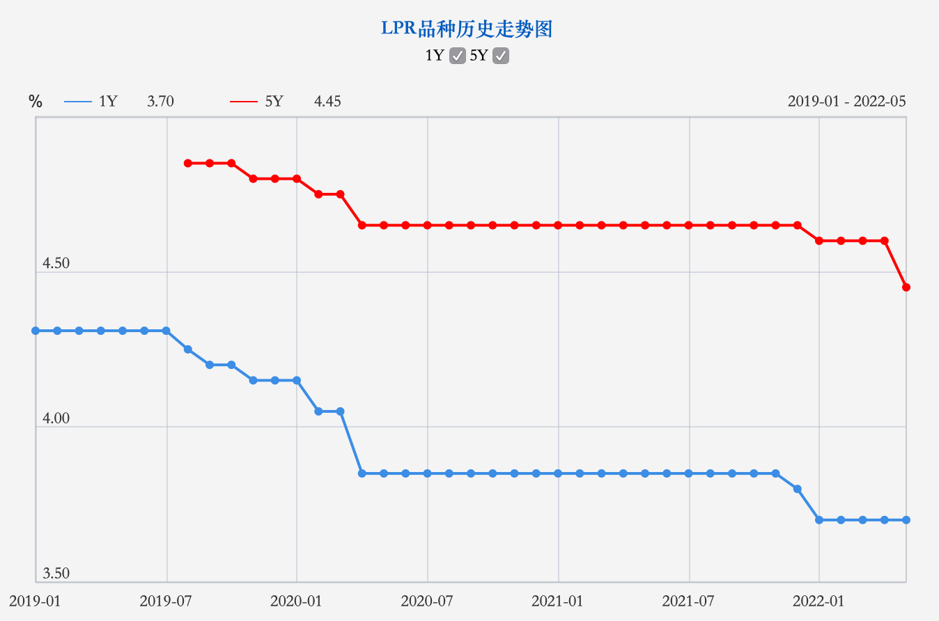 據(jù)中國(guó)人民銀行授權(quán)全國(guó)銀行間同業(yè)拆借中心公布,2022年5月20日貸款市場(chǎng)報(bào)價(jià)利率(LPR)為:1年期LPR為3.7%,5年期以上LPR為4.45%。二者前值分別為3.7%、4.6%。