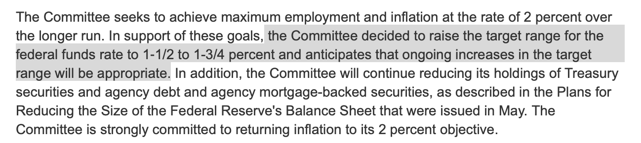 另外,聲明中還顯示,委員會將繼續(xù)減少其持有的國債和機(jī)構(gòu)債務(wù)以及抵押貸款支持證券(MBS),正如5月份發(fā)布的《減少美聯(lián)儲資產(chǎn)負(fù)債表規(guī)模的計(jì)劃》中所描述的一樣。委員會堅(jiān)定地致力于將通貨膨脹率恢復(fù)到2%的目標(biāo)。
