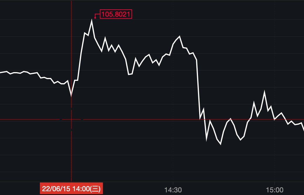 美元指數(shù)也同樣短線沖高至105以上后波動下行。據(jù)wind數(shù)據(jù)顯示,截至北京時間6月16日11點(diǎn)15分,美元指數(shù)報(bào)104.8900,年初至今上漲9.29%。