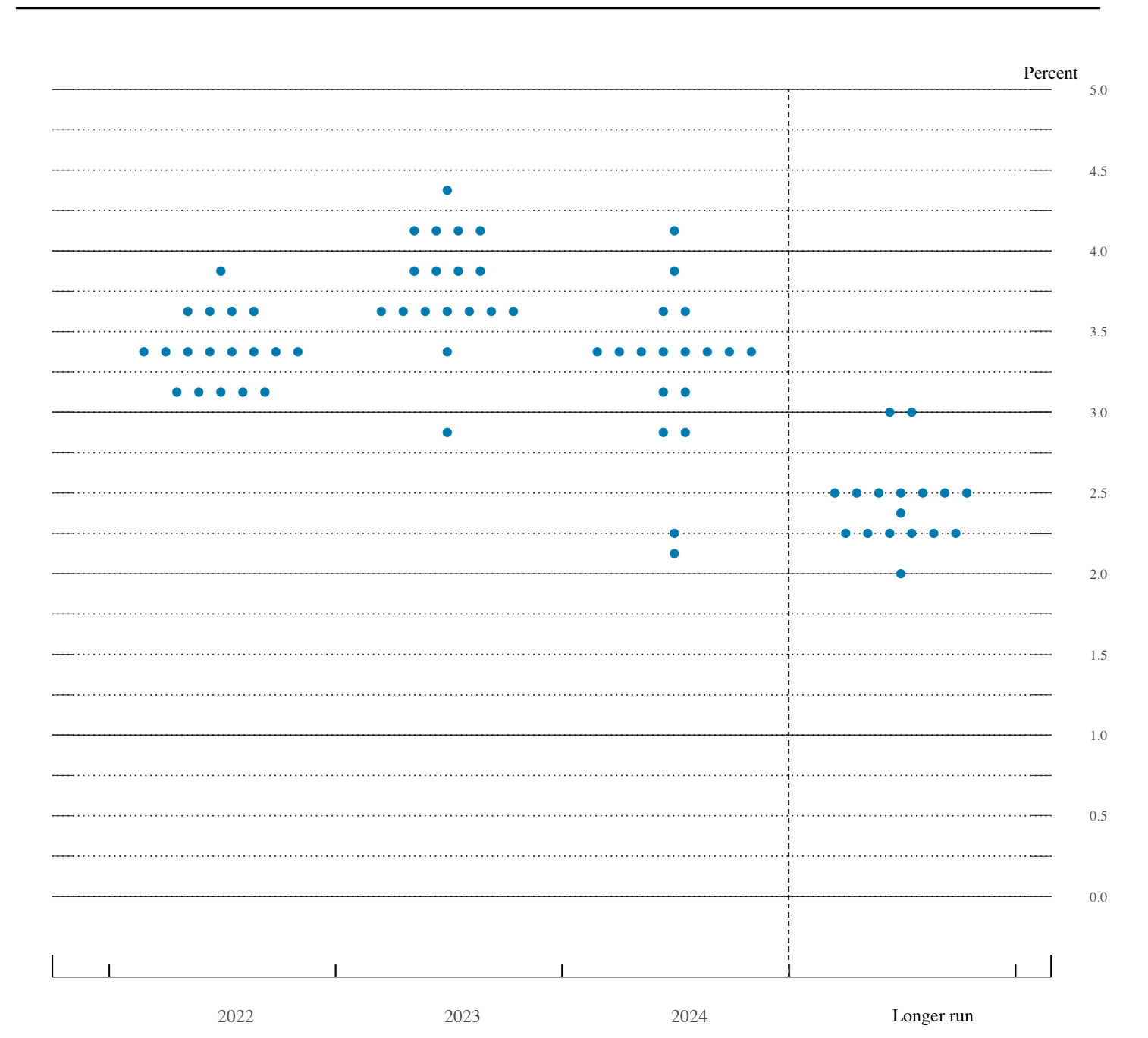 18名委員中,有13名預(yù)計(jì)到2022年底聯(lián)邦基金利率區(qū)間將達(dá)到或高于3.25%-3.5%;有16名預(yù)計(jì)到2023年底聯(lián)邦基金利率區(qū)間將達(dá)到或高于3.50%-3.75%。