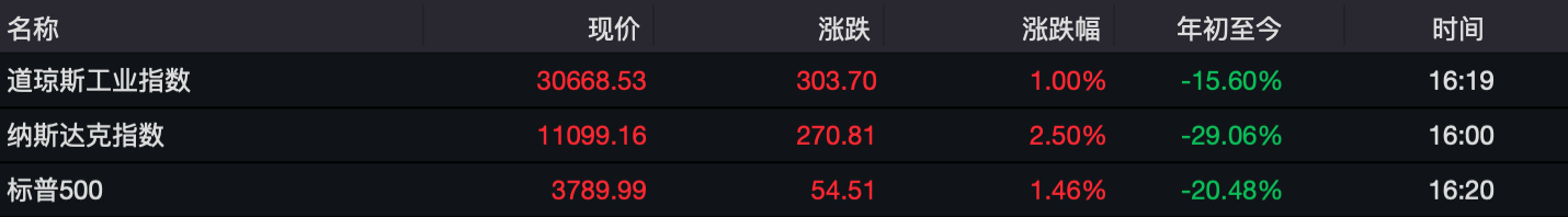 激進(jìn)加息落地后,美股表現(xiàn)較為積極。道瓊斯指數(shù)收報(bào)30668.53點(diǎn),上漲1.00%;納斯達(dá)克指數(shù)收報(bào)11099.16點(diǎn),上漲2.50%;標(biāo)普500指數(shù)收報(bào)3789.99點(diǎn),上漲1.46%。