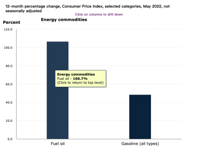 能源價格指數(shù)同比上漲34.6%,是自2005年9月份以來最大的同比漲幅。其中燃料油在5月份上漲了16.9%,12個月內(nèi)漲幅達到了106.7%。汽油價格在12個月內(nèi)漲幅也達到了48.7%。