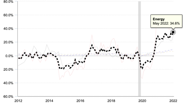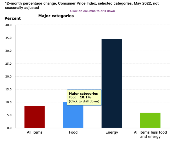 根據(jù)美國勞工統(tǒng)計局公布的5月份居民消費價格指數(shù)(CPI)數(shù)據(jù)顯示,5月份CPI同比上漲8.6%,為1981年12月以來新高;環(huán)比上漲1%,顯著高于預(yù)期的0.7%。其中能源成本的飆升推動了整體CPI數(shù)據(jù)的上漲。