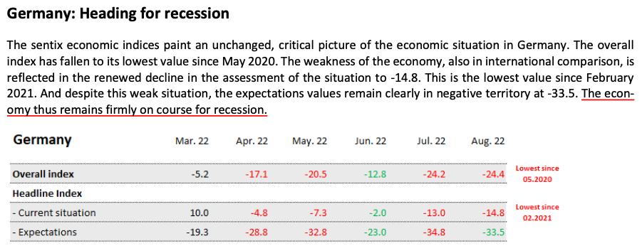 素有“歐洲經(jīng)濟(jì)火車頭”之稱的德國,在此次調(diào)研中情況也不容樂觀。德國8月份投資者信心指數(shù)錄得-24.4,為2020年5月份來新低;投資者對經(jīng)濟(jì)現(xiàn)狀的信心指數(shù)錄得-14.8,較前值繼續(xù)下降1.8,為2021年2月份來新低。報告稱,“德國經(jīng)濟(jì)正在‘堅定’走向衰退。”