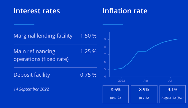 7月份,歐洲央行已進(jìn)行50個(gè)基點(diǎn)的加息,結(jié)束了主要存款利率過(guò)去8年一直為負(fù)的局面,此次9月份加息75個(gè)基點(diǎn)也是其歷史上最大的加息幅度。
