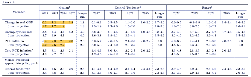 其中,2022年全年的GDP增長預(yù)期由6月份的1.7%下調(diào)至0.2%,2023年由1.7%下調(diào)至1.2%,均低于其預(yù)測的長期增長速度1.8%。同時,2022年P(guān)CE通脹預(yù)期由6月份的5.2%調(diào)高至5.4%,2023至2024年通脹水平也有小幅上調(diào)。