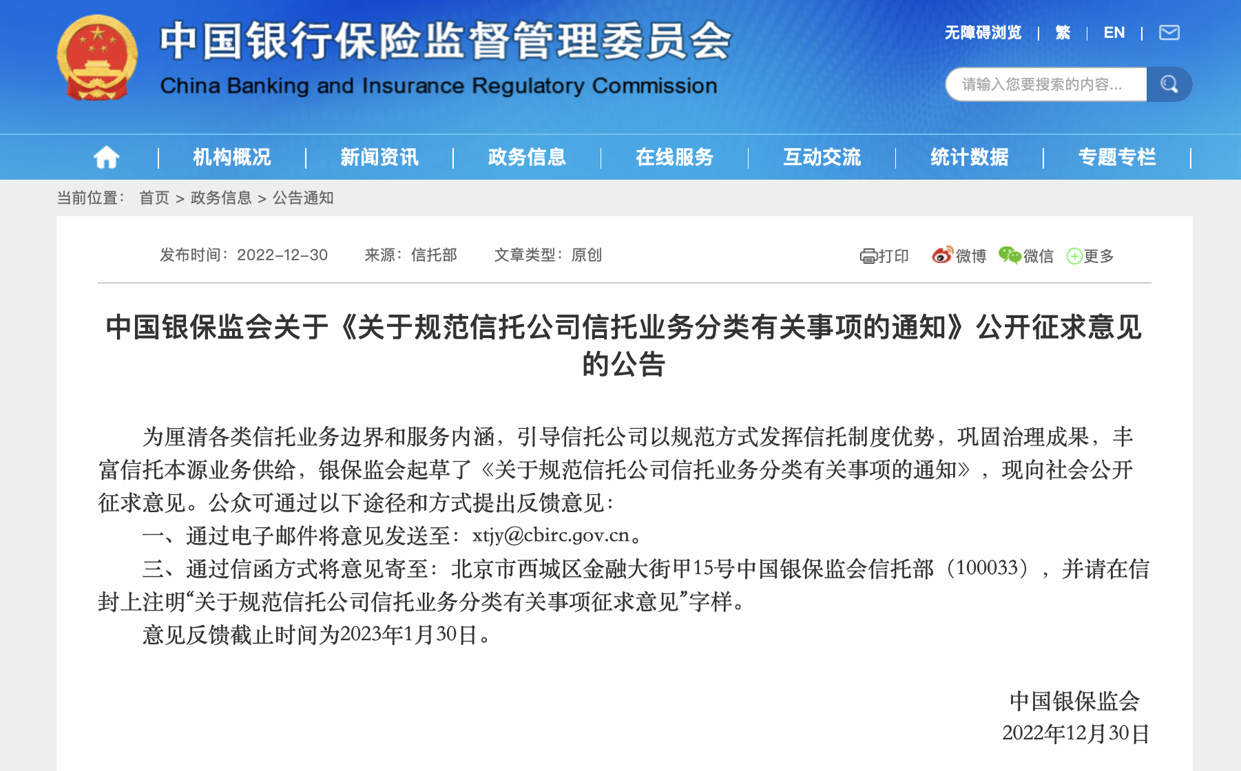 12月30日,銀保監(jiān)會官網(wǎng)發(fā)布《關(guān)于規(guī)范信托公司信托業(yè)務(wù)分類有關(guān)事項(xiàng)的通知(征求意見稿)》(以下簡稱《通知》)。