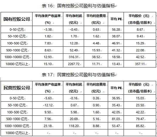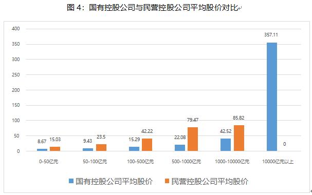 但是,對比國有控股公司和民營控股公司的盈利表現(xiàn)來看,我們發(fā)現(xiàn):(1)從平均凈資產(chǎn)收益率指標(biāo)看,市值在100-500億元和1000-10000億元的兩類區(qū)間中(2022年底,民營控股公司沒有萬億市值以上的公司),國有控股上市公司的平均凈資產(chǎn)收益率都低于民營控股公司的相同指標(biāo),特別是在市值1000-10000億元的區(qū)間中,民營控股公司的平均凈資產(chǎn)收益率是國有控股公司系統(tǒng)指標(biāo)的1.79倍。(2)從平均利息費用指標(biāo)看,國有控股公司的利息費用在所有市值區(qū)間,都明顯公司高于民營控股公司,特別是,在市值500-1000億元的區(qū)間中,國有控股公司的平均利息費用15.93億元,民營控股公司的平均利息費用是5.16億元,前者是后者的3.09倍。在市值1000-10000億元的區(qū)間中,國有控股公司的平均利息費用是38.52億元,民營控股公司的相同指標(biāo)是8.88億元,前者是后者的4.34倍。(3)從PE倍數(shù)看,在市值500億元以下的區(qū)間中,國有控股公司的平均PE都高于民營控股公司,但是,在市值500-1000億元和1000-10000億元的兩個區(qū)間中,國有控股公司的平均PE分別為41.32倍和18.58倍,都明顯低于民營控股公司的平均PE的81.03倍和53.47倍。(4)從平均股價看,無論在哪一類市值區(qū)間,國有控股公司的股價都低于民營控股公司的股價,其中,在500-1000億元市值區(qū)間,民營控股公司的平均股價79.47元,甚至達到國有控股公司相同指標(biāo)(22.08元)的3.60倍;在市值1000-10000億元區(qū)間內(nèi),民營控股公司的平均股價85.82元是國有控股公司相同指標(biāo)(42.52元)的2.02倍。