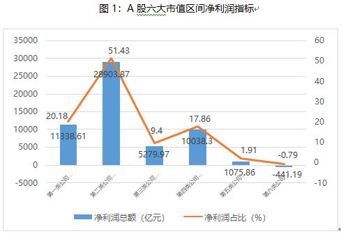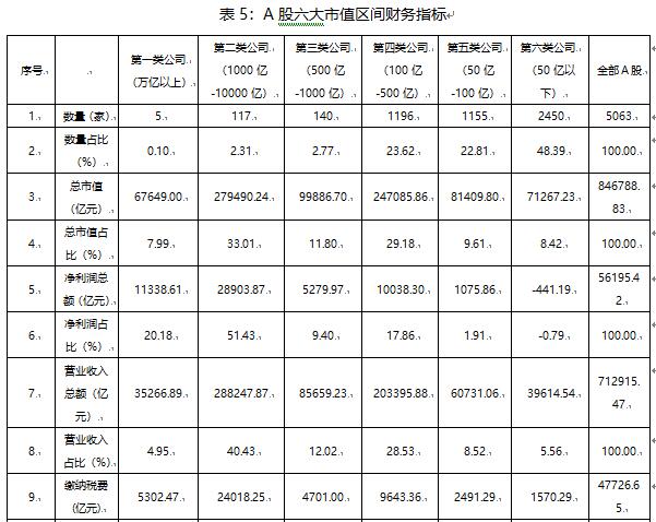 2022年,A股市場頭部效應(yīng)顯著,高市值上市公司經(jīng)營業(yè)績表現(xiàn)極為優(yōu)秀。將A股上市公司按照市值分成六大區(qū)間(見下表),數(shù)據(jù)顯示,千億市值以上的上市公司數(shù)量為122家,占比2.41%,市值規(guī)模達到34.71萬億元,占比40.99%。從盈利指標(biāo)來看,千億級上市公司的營業(yè)收入總額達到32.35萬億元,占比45.38%;凈利潤總額達到4.02萬億元,占比71.61%。其中,萬億市值以上的上市公司有5家,分別為貴州茅臺、工商銀行、建設(shè)銀行、中國移動、農(nóng)業(yè)銀行,其合計總市值、營業(yè)收入、凈利潤分別為6.76萬億元,3.53萬億元和1.13萬億元,占A股上市公司相同指標(biāo)總額的比重分別為7.99%、4.95%和20.18%;其平均凈利潤和營業(yè)收入分別達到2267.72億元和7053.38億元,均遠超其他類別的上市公司。