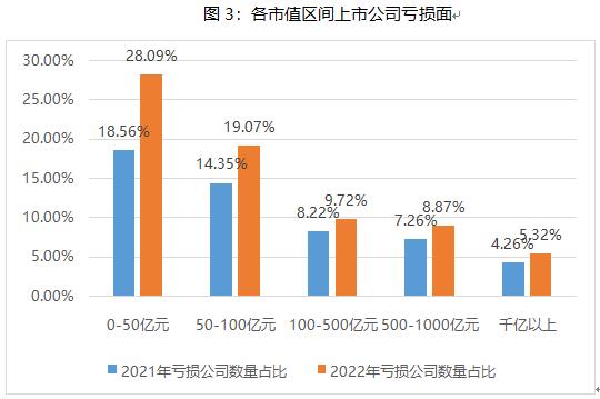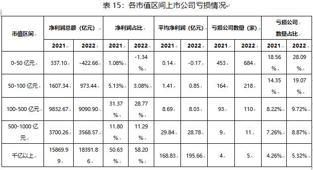 將實體類上市公司按照市值區(qū)間劃分,虧損公司主要發(fā)生在市值500億元以下的公司類型中,有1012家公司虧損,其中:(1)市值50億元以下的公司,有684家公司虧損,虧損面28.09%,虧損面比上年(18.56%)增加了近10個百分點,這類公司凈利潤總額發(fā)生絕對虧損,虧損總金額422.66億元;(2)市值50-100億元的公司,有218家公司虧損,虧損面為19.07%,比上年(14.35%)增加近5個百分點;(3)市值100-500億元的公司,有110家公司虧損,虧損面9.72%,比上年(8.22%)增加1.5個百分點;(4)市值500-1000億元的公司,有11家公司虧損,虧損面8.87%,比上年(7.26%)增加1.61個百分點;(5)市值1000億元以上的公司有5家虧損,虧損面5.32%,比上年(4.26%)增加1.06個百分點。上述可見,隨著市值區(qū)間的提升,虧損上市公司數(shù)量和虧損面都在絕對下降。
