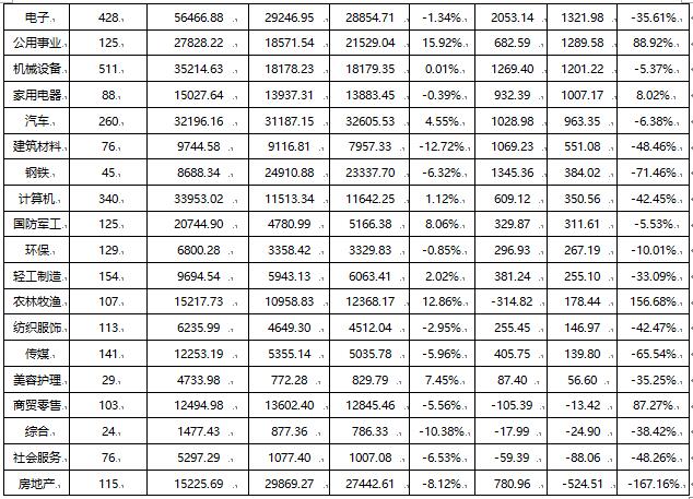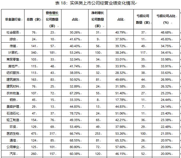 凈利潤出現(xiàn)虧損且虧損面在30%以上的有7大行業(yè),分別是社會服務(wù)、綜合、傳媒、計算機、商貿(mào)零售、房地產(chǎn)和紡織服飾,其虧損面和虧損上市公司家數(shù)分別為48.68%(37家)、45.83%(11家)、34.75%(49家)、34.41%(117家)、33.98%(35家)、33.91(39家)和33.63%(38家)。其中前兩大行業(yè)的占比更是接近50%,此外,計算機和醫(yī)藥生物的虧損公司數(shù)量分別達到117家和100家,行業(yè)經(jīng)營業(yè)績壓力較大。