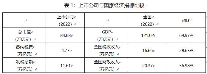 2022年,A股上市公司共繳納稅費4.77萬億元,占全國稅收收入總額(16.66萬億元)的28.65%;上市公司總利稅為11.61萬億元,占全國財政收入的56.98%。