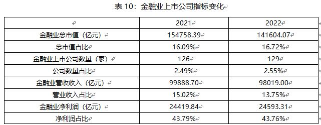 2022年,金融業(yè)上市公司數(shù)量增加了3家,達129家,總市值14.16萬億元,相較于2021年下降了8.50%,數(shù)量和總市值分別占A股公司總量的2.55%和16.72%。金融業(yè)上市公司當(dāng)年的營收和凈利潤增速有所放緩,其中,營業(yè)收入為9.80萬億元,同比下降1.87%,比上年減少了1.28個百分點;但創(chuàng)利水平穩(wěn)定,凈利潤達2.45萬億元,同比上升0.71%。雖然金融業(yè)上市公司占A股公司總量的比例僅為2.55%,但是其創(chuàng)造的凈利潤占A股凈利潤總額的比重高達43.76%,幾近半壁江山。