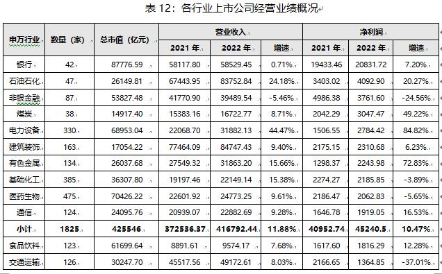 按照申萬行業(yè)分類并對比各行業(yè)的業(yè)績指標(biāo),2022年上市公司凈利潤總額排名前十的行業(yè)分別為銀行、石油石化、非銀金融、煤炭、電力設(shè)備、建筑裝飾、電力設(shè)備、有色金屬、基礎(chǔ)化工、醫(yī)藥生物和通信。十大行業(yè)上市公司總數(shù)為1825家,占A股公司總量的36.05%,總市值合計為42.55萬億元,占比50.25%;營業(yè)收入41.68萬億元,占比58.47%;凈利潤4.52萬億元,占比80.43%。其中,得益于中國綠色能源版圖快速擴容和新能源技術(shù)快速發(fā)展等因素,電力設(shè)備和有色金屬兩大行業(yè)的創(chuàng)利創(chuàng)收水平表現(xiàn)優(yōu)異,兩者均實現(xiàn)了營收凈利的雙增長,且同比增速超過其他大部分行業(yè)。
