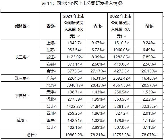 從長三角、珠三角、京津冀和成渝四個經(jīng)濟區(qū)的上市公司研發(fā)投入情況來看,京津冀的研發(fā)投入總額及占比均為兩年最高,長三角次之。其中,北京2022年上市公司研發(fā)投入總額達到4667.38億元,占比近30%,遠超其他省份,而各經(jīng)濟區(qū)上市公司研發(fā)投入的穩(wěn)定增長正是響應(yīng)創(chuàng)新驅(qū)動發(fā)展戰(zhàn)略的重要表現(xiàn)。
