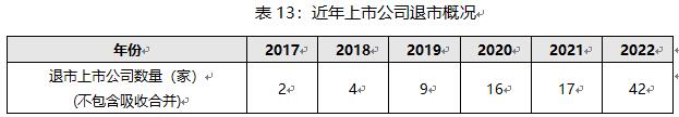 2022年,A股市場共計退市42家上市公司,創(chuàng)下退市數(shù)量新高,其中,有24家上市公司因被*ST后首個會計年度被會計師事務(wù)所出具無法表示意見或者否定意見的審計報告而退市,“非標(biāo)退市”已經(jīng)成為推動資本市場優(yōu)勝劣汰中非常重要的一環(huán),1家上市公司因連續(xù)20個交易日的每日股票收盤價均低于人民幣1元而被退市。板塊情況來看,不同板塊退市公司數(shù)量分別為滬主板18家、深主板16家、創(chuàng)業(yè)板8家。行業(yè)情況來看,退市公司數(shù)量最多的前4個行業(yè)分別為傳媒(7家)、非銀金融(4家)、醫(yī)藥生物(3家)、社會服務(wù)(3家)。隨著注冊制改革的進一步深化,可以預(yù)見上市公司退市將逐步常態(tài)化,上市公司只有堅守合規(guī)底線,才能保證基業(yè)長青。