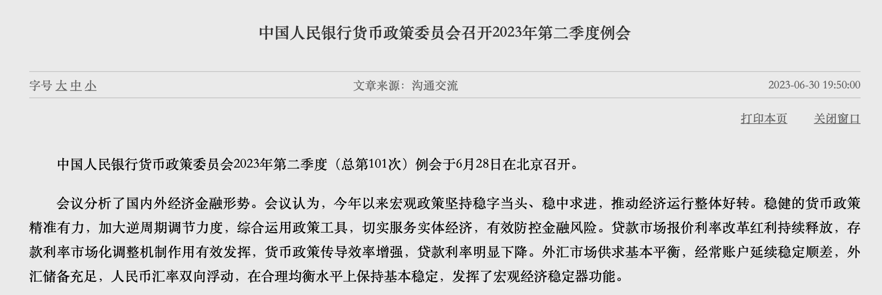 6月30日,中國人民銀行網(wǎng)站發(fā)布消息,中國人民銀行貨幣政策委員會2023年第二季度(總第101次)例會于6月28日在北京召開。會議指出,加大宏觀政策調(diào)控力度,精準(zhǔn)有力實施穩(wěn)健的貨幣政策,搞好跨周期調(diào)節(jié),更好發(fā)揮貨幣政策工具的總量和結(jié)構(gòu)雙重功能,全力做好穩(wěn)增長、穩(wěn)就業(yè)、穩(wěn)物價工作,切實支持?jǐn)U大內(nèi)需,改善消費環(huán)境,促進經(jīng)濟良性循環(huán),為實體經(jīng)濟提供更有力支持