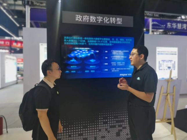 浪潮云工作人員(右一)介紹一體化政務(wù)大數(shù)據(jù)平臺(tái) 韓昱/攝