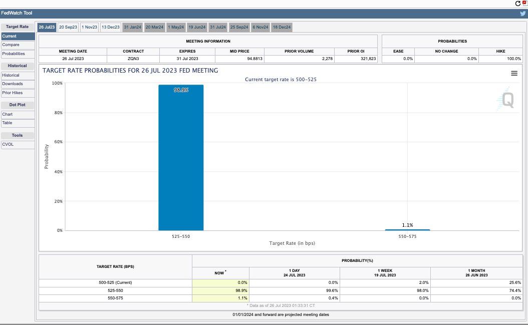 《證券日報》記者在7月26日通過芝商所FedWatch工具測算,當(dāng)前市場押注7月份美聯(lián)儲加息25個基點的概率高達98.9%,押注加息50個基點的概率為1.1%。值得一提的是,記者在7月13日通過工具測算時,市場押注美聯(lián)儲本月不加息的概率尚為7.6%,當(dāng)前此選項已不存在。