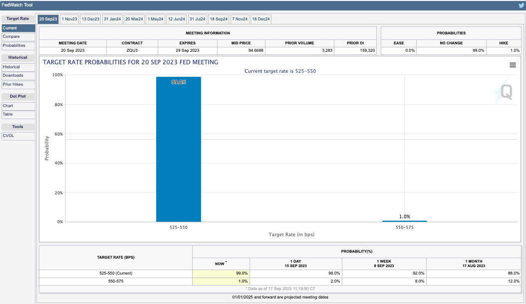 根據(jù)美聯(lián)儲(chǔ)公布的日程安排,北京時(shí)間9月21日(周四)凌晨,美聯(lián)儲(chǔ)將公布9月份的貨幣政策決議。記者在9月18日通過(guò)芝商所的FedWatch工具測(cè)算,當(dāng)前市場(chǎng)押注9月份美聯(lián)儲(chǔ)維持利率不變的概率高達(dá)99%,選擇加息25個(gè)基點(diǎn)的概率僅為1%。