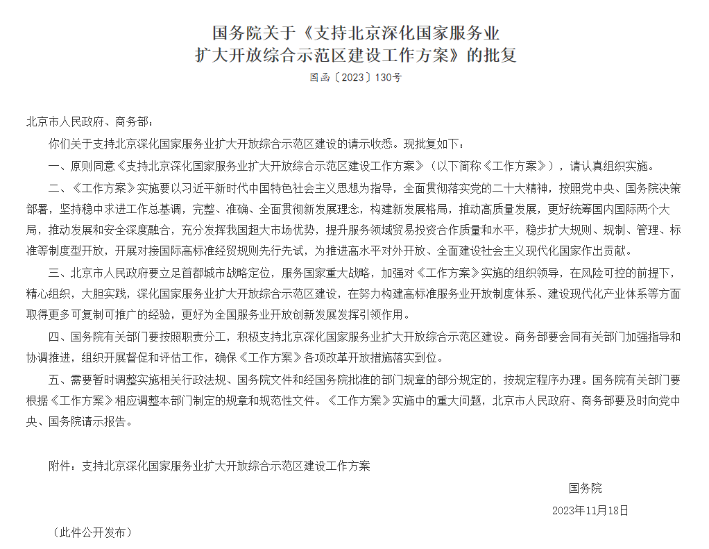 國務(wù)院關(guān)于《支持北京深化國家服務(wù)業(yè)擴(kuò)大開放綜合示范區(qū)建設(shè)工作方案》的批復(fù)