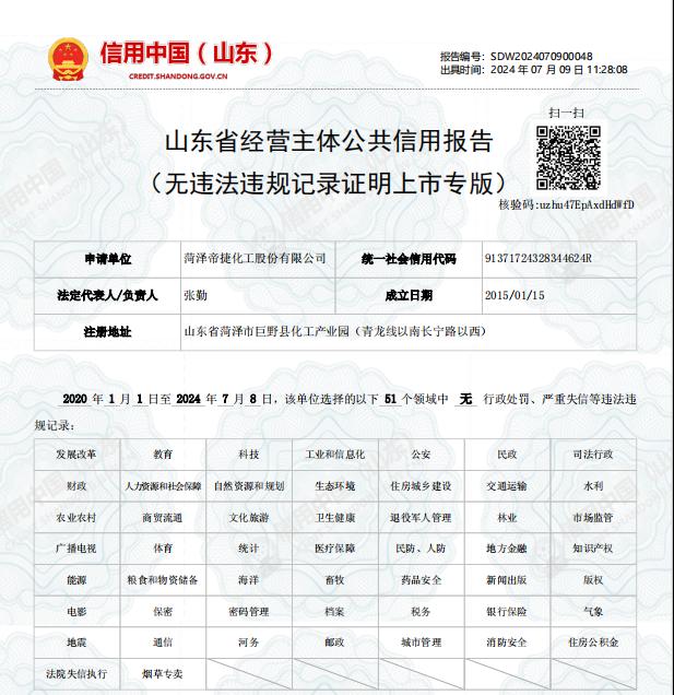 (圖片說明:菏澤帝捷化工股份有限公司取得菏澤市第一份上市專版公共信用報告)