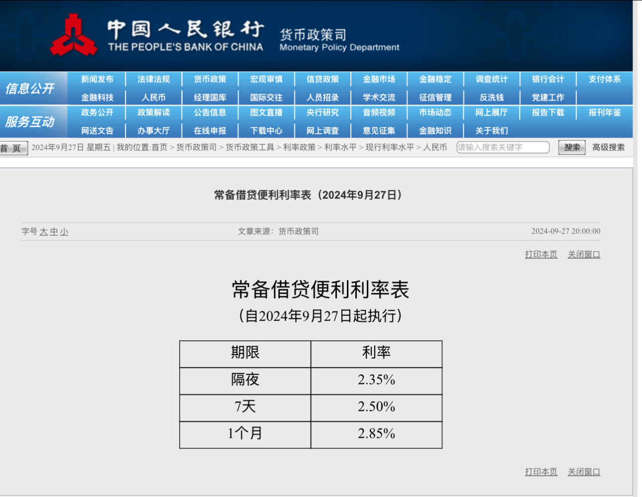 本報訊 (記者韓昱)中國人民銀行網(wǎng)站9月27日發(fā)布的常備借貸便利利率表顯示,隔夜、7天、1個月期限的常備借貸便利利率分別為2.35%、2.5%、2.85%,均較此前下調(diào)20個基點。該利率表自9月27日起執(zhí)行。