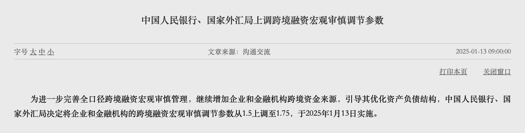 1月13日,中國人民銀行發(fā)布消息,為進(jìn)一步完善全口徑跨境融資宏觀審慎管理,繼續(xù)增加企業(yè)和金融機(jī)構(gòu)跨境資金來源,引導(dǎo)其優(yōu)化資產(chǎn)負(fù)債結(jié)構(gòu),中國人民銀行、國家外匯局決定將企業(yè)和金融機(jī)構(gòu)的跨境融資宏觀審慎調(diào)節(jié)參數(shù)從1.5上調(diào)至1.75,于2025年1月13日實施。