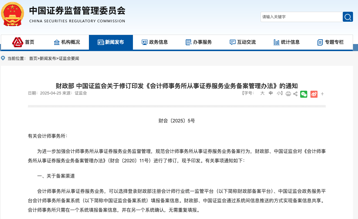 據(jù)中國(guó)證監(jiān)會(huì)網(wǎng)站4月25日消息,為進(jìn)一步加強(qiáng)會(huì)計(jì)師事務(wù)所從事證券服務(wù)業(yè)務(wù)監(jiān)督管理,規(guī)范會(huì)計(jì)師事務(wù)所從事證券服務(wù)業(yè)務(wù)備案行為,財(cái)政部、中國(guó)證監(jiān)會(huì)對(duì)《會(huì)計(jì)師事務(wù)所從事證券服務(wù)業(yè)務(wù)備案管理辦法》(以下簡(jiǎn)稱《辦法》)進(jìn)行了修訂,并予印發(fā)。