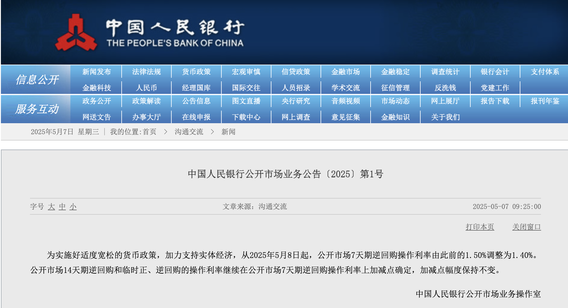 本報訊 (記者韓昱)中國人民銀行5月7日發(fā)布《中國人民銀行公開市場業(yè)務(wù)公告〔2025〕第1號》。公告稱,為實施好適度寬松的貨幣政策,加力支持實體經(jīng)濟,從2025年5月8日起,公開市場7天期逆回購操作利率由此前的1.50%調(diào)整為1.40%。公開市場14天期逆回購和臨時正、逆回購的操作利率繼續(xù)在公開市場7天期逆回購操作利率上加減點確定,加減點幅度保持不變。
