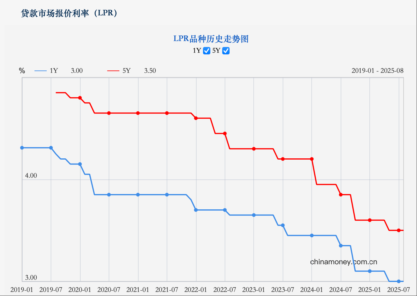 8月20日,中國人民銀行授權(quán)全國銀行間同業(yè)拆借中心公布,2025年8月20日貸款市場報價利率(LPR)為:1年期LPR為3.0%,5年期以上LPR為3.5%。兩個期限品種LPR較上月均維持不變。