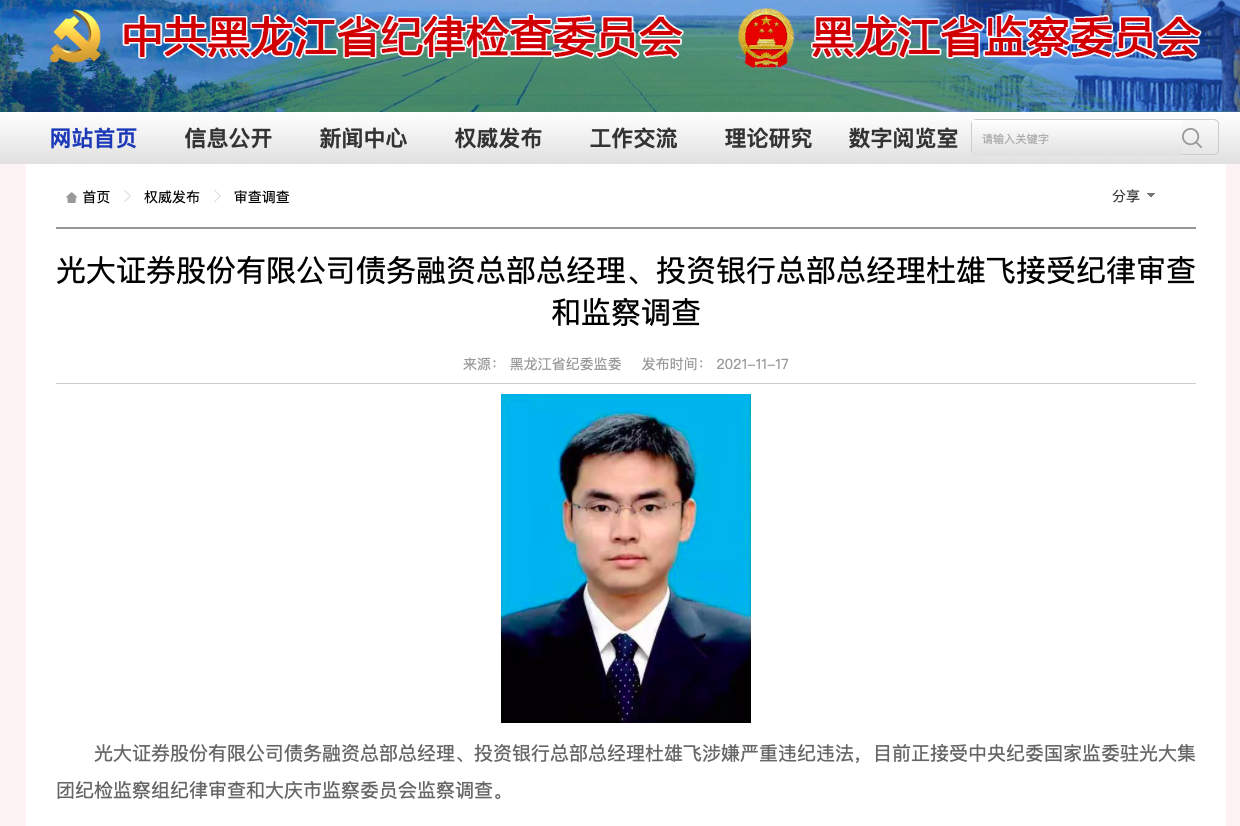 11月17日,黑龍江省紀(jì)委監(jiān)委網(wǎng)站顯示,光大證券股份有限公司債務(wù)融資總部總經(jīng)理、投資銀行總部總經(jīng)理杜雄飛涉嫌嚴(yán)重違紀(jì)違法,目前正接受中央紀(jì)委國家監(jiān)委駐光大集團紀(jì)檢監(jiān)察組紀(jì)律審查和大慶市監(jiān)察委員會監(jiān)察調(diào)查。