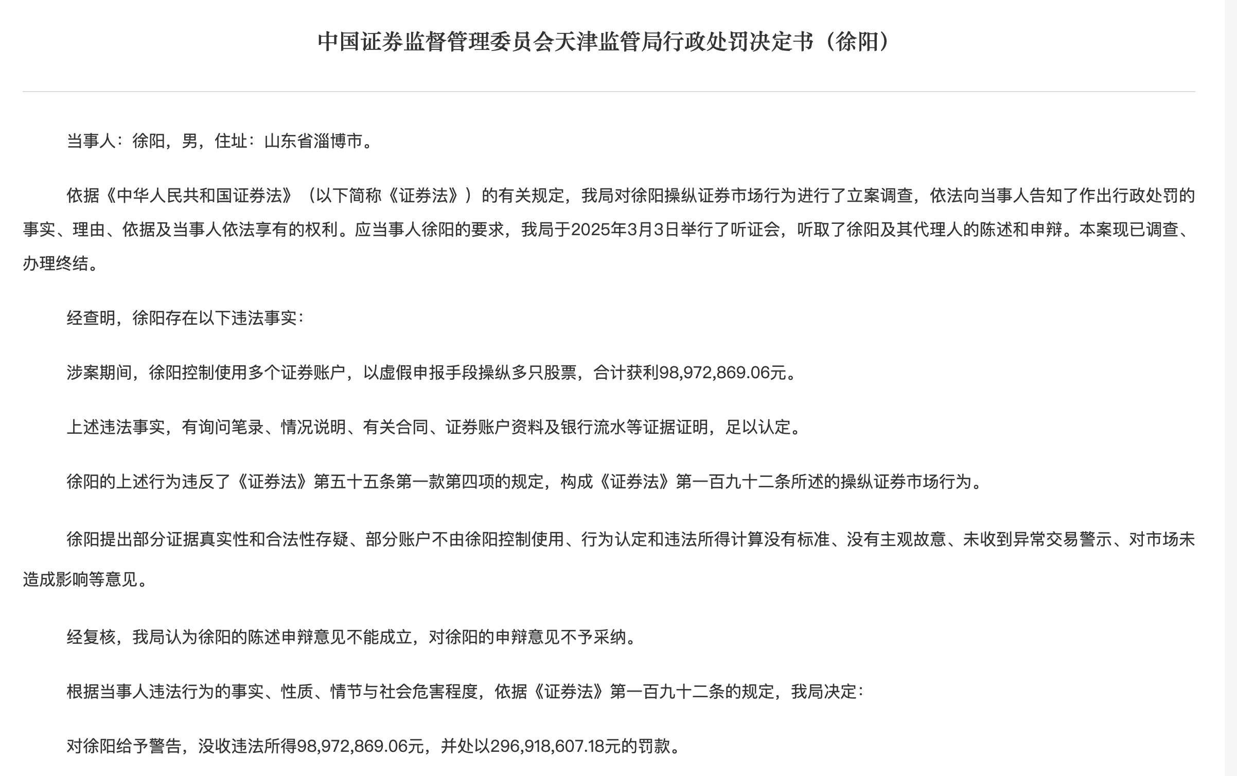 天津證監(jiān)局表示,依據(jù)《中華人民共和國證券法》(以下簡稱《證券法》)的有關規(guī)定,天津證監(jiān)局對徐陽操縱證券市場行為進行了立案調(diào)查,依法向當事人告知了作出行政處罰的事實、理由、依據(jù)及當事人依法享有的權利。應當事人徐陽的要求,天津證監(jiān)局于2025年3月3日舉行了聽證會,聽取了徐陽及其代理人的陳述和申辯。本案現(xiàn)已調(diào)查、辦理終結。