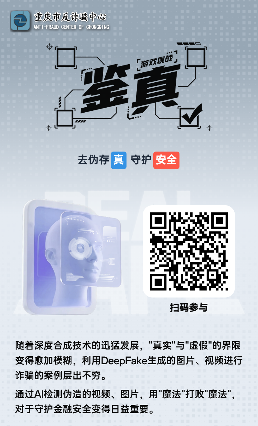 此外,“三件套”還包含針對更廣泛觀眾的AI反詐短劇,真實還原“保本高息”理財騙局,直擊痛點;聚焦前沿科技的“鑒真”防深偽H5小游戲,通過模擬深偽詐騙場景,讓用戶在趣味闖關(guān)中掌握識別AI換臉、擬聲的技巧,實現(xiàn)從“被動聽”到“主動學(xué)”的轉(zhuǎn)變。