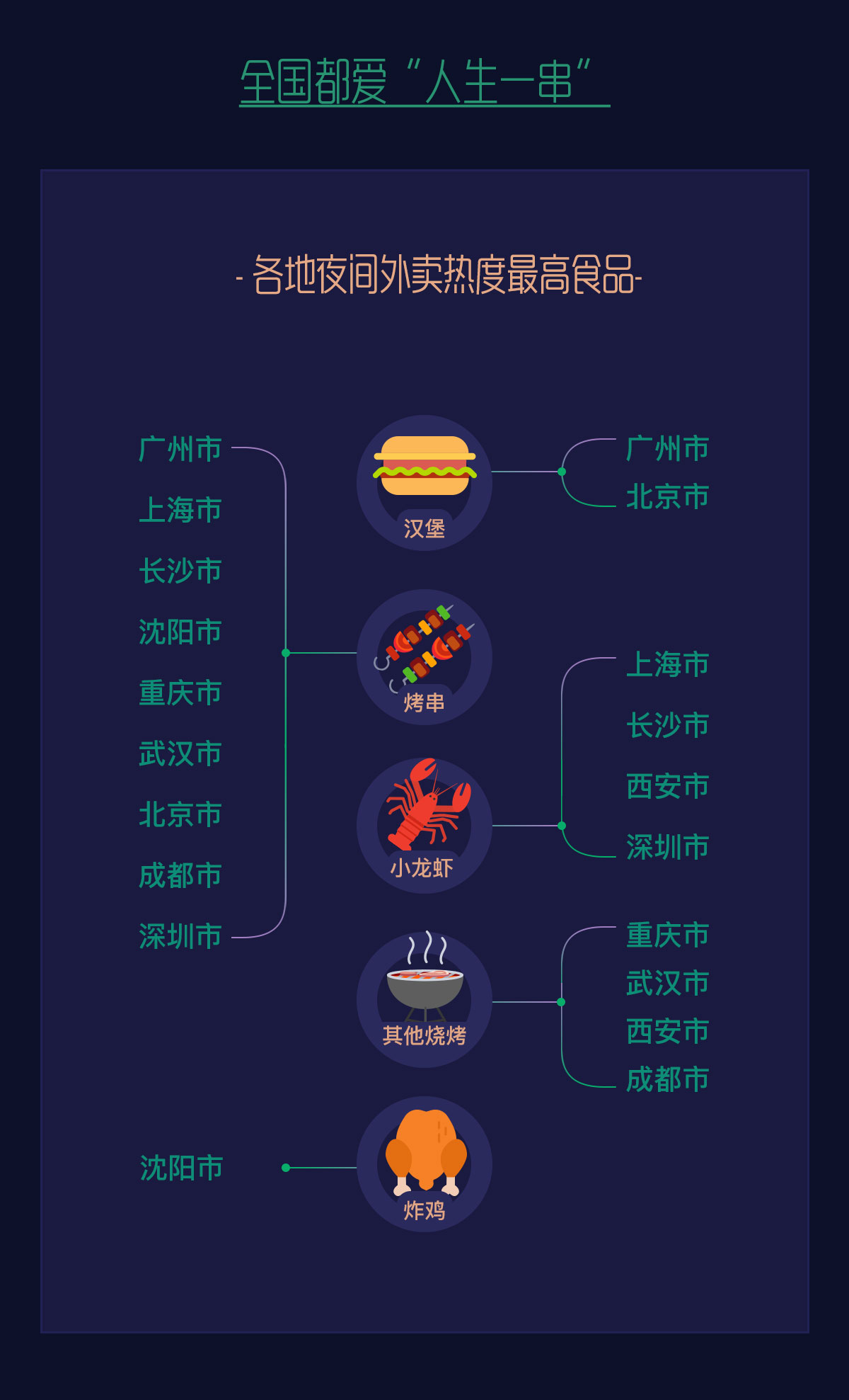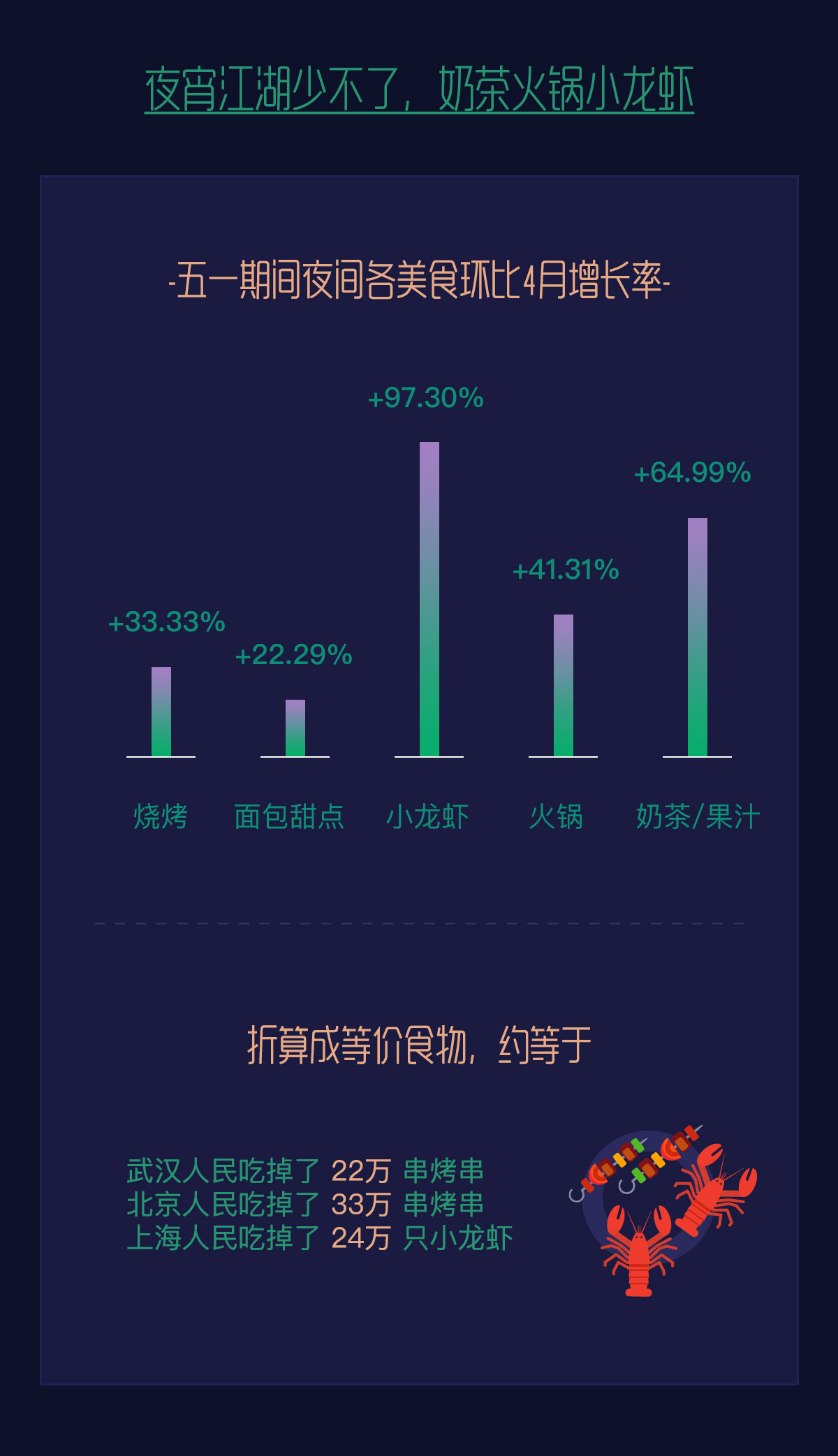 夜宵江湖戰(zhàn)況“激烈”,烤串成為多個(gè)城市美團(tuán)用戶最愛的夜間外賣。面包甜點(diǎn)、小龍蝦、火鍋、奶茶等其他宵夜品類也有明顯增長(zhǎng),折算成等價(jià)食物,約等于北京人民吃掉33萬串烤串,武漢人民吃掉22萬串烤串,上海人民吃了24萬只小龍蝦,“逛吃逛吃”成為夜晚首選。北京人民最愛三里屯,重慶人都去解放碑。