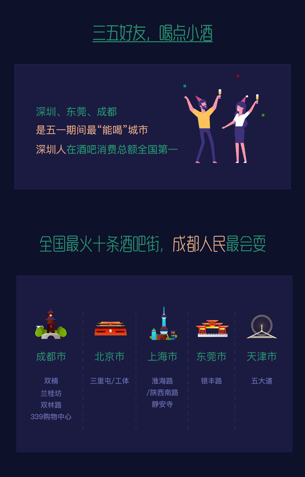 深圳、東莞、成都,是在五一期間最“能喝”的城市,深圳人在酒吧的消費(fèi)全國第一。根據(jù)美團(tuán)數(shù)據(jù),成都人民最愛耍,全國最火熱的10條酒吧街,成都占據(jù)4個(gè)名額,小酌兩杯成為假期夜間的熱門選擇。