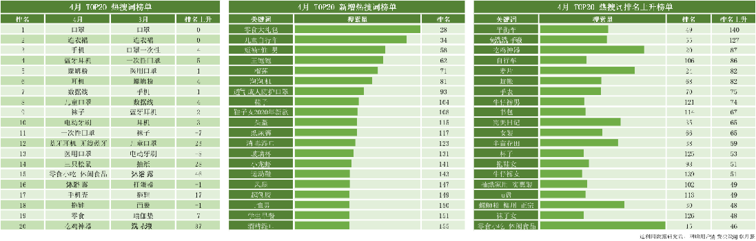 5月7日,返利網數據研究院發(fā)布了新一期的《網購用戶消費決策洞察月報》(以下簡稱“月報”)。報告顯示,與3月相較,口罩相關搜索熱度明顯降低,居家消費需求下滑,戶外用品、服飾、3C數碼相關搜索量激增,夏日經濟初現(xiàn)威力。