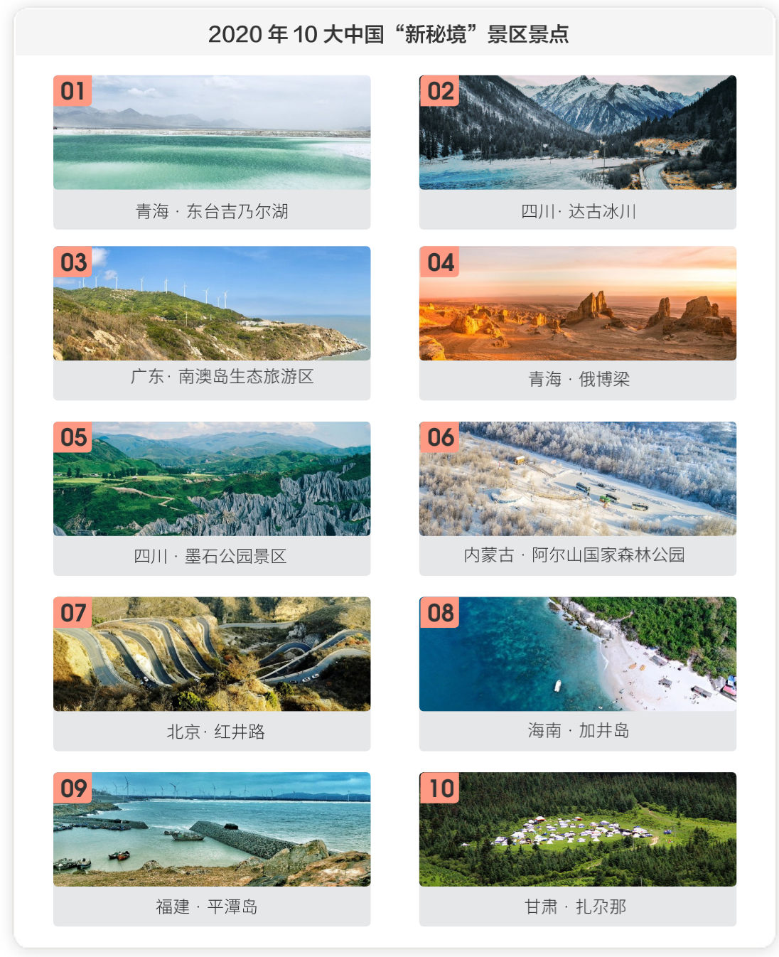 報(bào)告顯示,青海的東臺(tái)吉乃爾湖,四川的達(dá)古冰川,廣東的南澳島生態(tài)旅游區(qū)登陸2020年10大中國(guó)“新秘境”榜單前三位。
