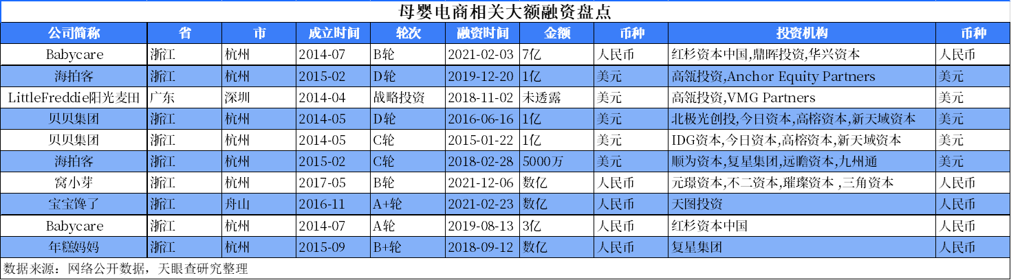 據(jù)天眼查不完全統(tǒng)計,母嬰電商相關(guān)融資合計發(fā)生110余起,融資金額超70億元;
